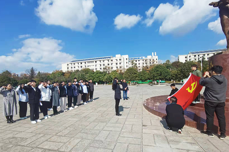 20名新党员在杰出校友聂耳塑像下,秦丽娟书记领誓,面向党旗庄严宣誓,向党和人民许下郑重承诺。孙梦奇同学代表20名新党员发言,感谢党组织的培养和教育,以身边的优秀党员为榜样,用党员标准严格要求自己,用实际行动践行誓言。
