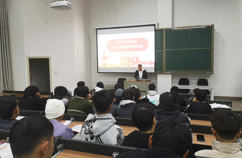12月23日,为积极响应国家号召,贯彻落实征兵政策,进一步加强学生国防意识,提高学生参军报国的积极性,美术与艺术设计学院召开2022年春季征兵动员大会。学院党委副书记张晓鸥、负责征兵工作辅导员董久章及全体毕业班男生参加了本次会议。