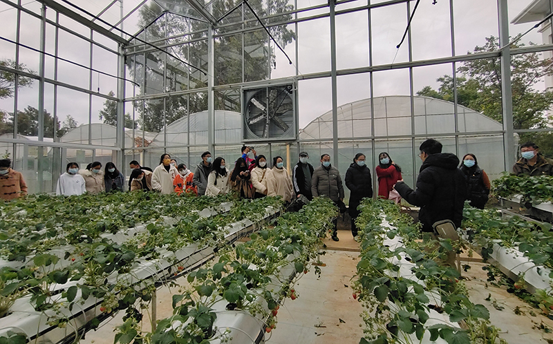 在农学与生命科学学院阳光中庭,翟书华教授为大家讲解种植的云南特色植物的分类、栽培知识;在智慧农业试验基地的草莓大棚里,苏源博士介绍了智慧农业设施和发展前景。