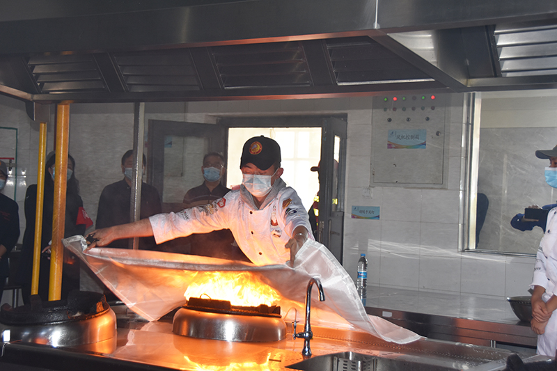在油锅灭火演练中,云南华铄消防安全职业培训学校教学部主任、高级讲师李超为同学们讲授了初期油锅着火的处理方法,重点介绍了灭火毯的使用方法并进行了演练;同学们饶有兴致地参加了灭火毯扑灭油锅起火的演练。