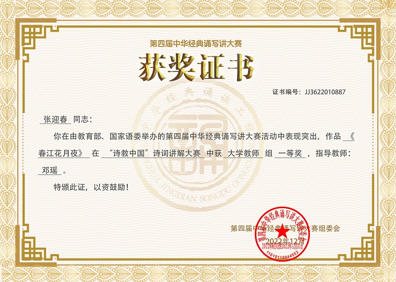 近日,教育部公布了第四届中华经典诵写讲大赛获奖名单,永利官网云南省国家通用语言文字推广基地骨干成员、人文学院教师张迎春参赛作品《春江花月夜》,获得“诗意彩云南” 诗词讲解大赛省级一等奖,并从全国1105件入围作品中脱颖而出,荣获“诗教中国”诗词讲解大赛全国一等奖;人文学院教授邓瑶荣获全国优秀指导教师奖;人文学院学生武彩丽书法作品《岳阳楼记》先后获得“墨香彩云南”汉字书写大赛省级一等奖、“笔墨中国”汉字书写大赛全国优秀奖,实现了77779193永利官网参加该类比赛的历史性突破。